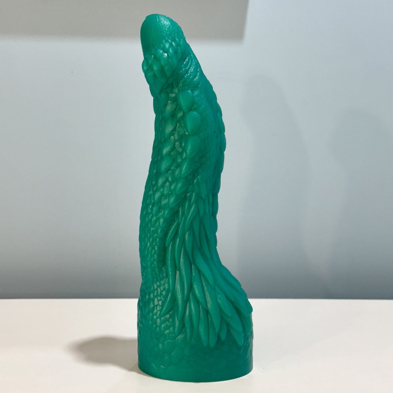As with most of the dildos I have received from Mr Hankey’s; the packaging is very minimal. Each toy is created and then just wrapped in some cellophane and…well that’s it. Its very economical and ensures there’s not much waste created (and also creates less embarrassment when you have to throw sex toy packaging away). Dildo’s & Dragons is your classic fantasy dildo archetype; it’s scaly and textured and looks very magical; but it still maintains a level of realism in the sense it’s pretty standard in shape – I always think these are great for people who like the idea of fantasy dildos, but struggle with the idea of using shapes inspired by actual creatures/animals.